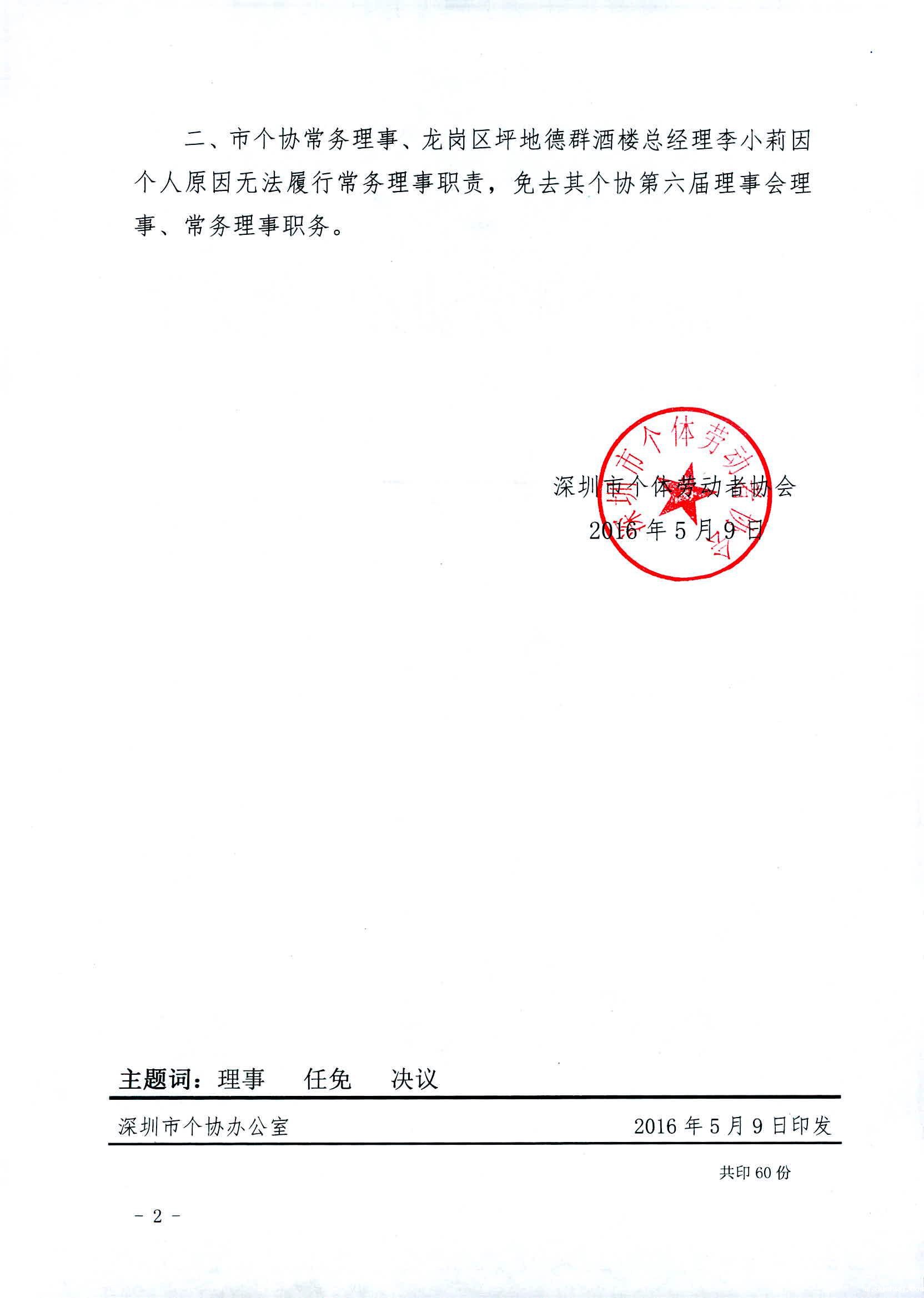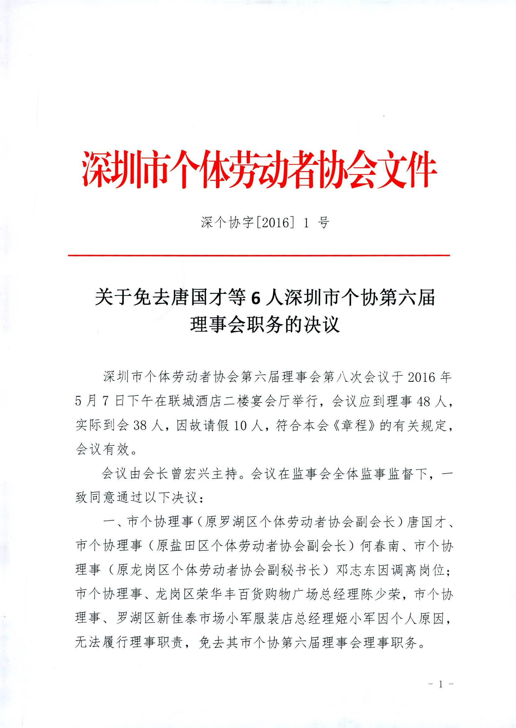 深个协字【2016】1号关于免去唐国才等6人深圳市个协第六届理事会职务的决议